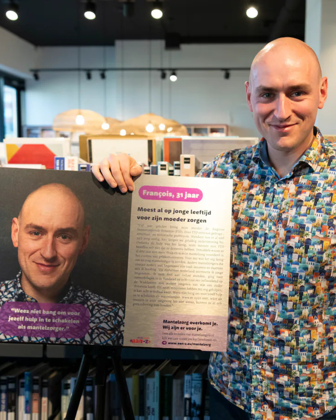 De expositie toont de verhalen van drie mantelzorgers, François, Kim en Iemke. Zij delen hun ervaringen, welke steun zij krijgen en delen tips in de hoop dat andere inwoners zich herkennen en weten waar zij terecht kunnen voor een luisterend oor, steun of praktische tips. Bekijk de volledige verhalen via: www.aan-z.eu/mantelzorg |
