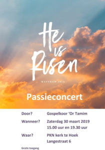 Op zaterdag 30 maart aanstaande verzorgt Gospelkoor 'Or Tamim twee passie concerten in de kerk van de Protestantse gemeente te Hoek. De toegang is gratis. |