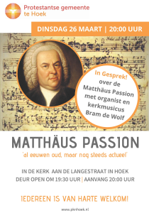 ‘In Gesprek’ over de Matthäus Passion met Bram de Wolf, organist en kerkmusicus locatie: kerkzaal, aanvang 20.00 uur, inloop vanaf 19.30 uur meer info: Corry Siersema of Cor-Elli de Bruijn |