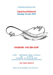 Zondag 29 mei 2016 om 14.00 uurOpenluchtdienst Camping 't SluisjeVoorganger(s): Ds. A.P. van der Maas Openluchtdienst die is voorbereid en waaraan zal worden meegewerkt door de tieners uit de gemeente. De dienst zal plaats vinden op Mini-Camping ’t Sluisje aan de Lovenweg 1. Het thema zal wellicht nieuwsgierigheid opwekken: “Dagboek van een duif…”. |
