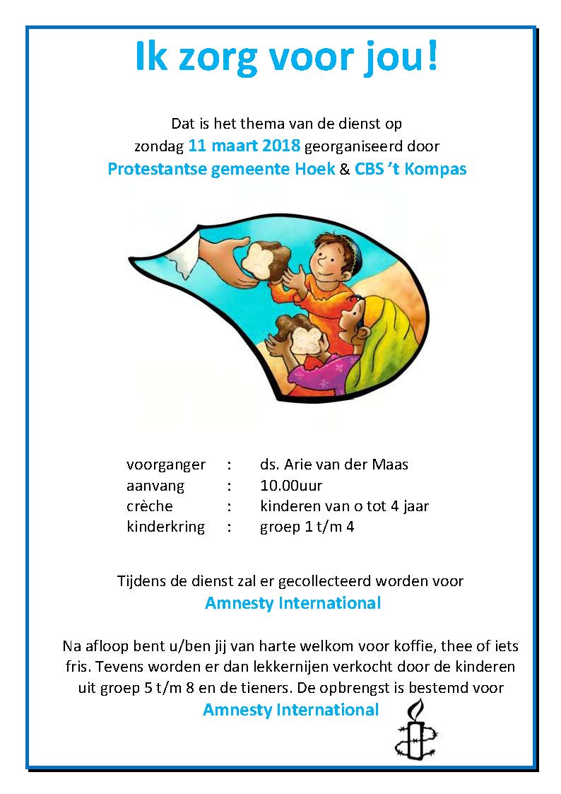 Deze zondag een bijzondere viering i.s.m. Christelijke Basisschool ’t Kompas. De dienst begint om 10.00 uur en onze eigen predikant, ds. Arie van der Maas hoopt hierin voor te gaan. Het thema van de dienst sluit aan bij het project van de kinderkring: Ik zorg voor jou!